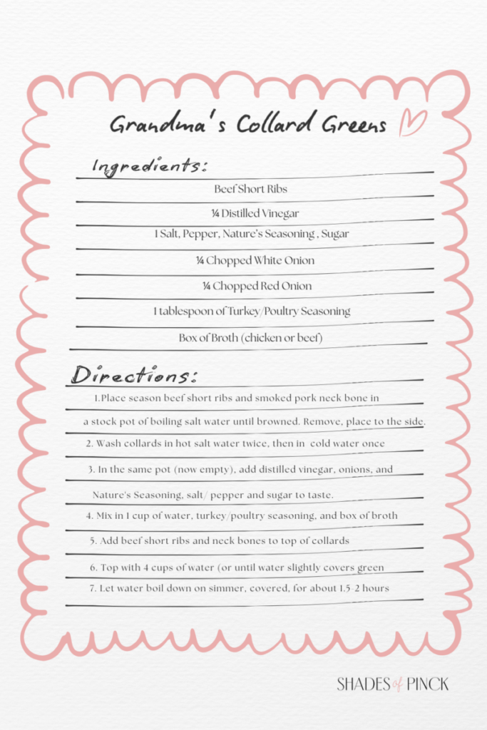 One dish that’s always going to be at our table, no matter the holiday, is collard greens. Growing up they were a staple at Sunday dinner, so I had watched my grandma make them countless times. It wasn’t until I was older that I realized  she never used recipe cards for this dish (or really any); everything was by memory. And I honestly didn’t realize just how hard that would be for me until I followed her around the kitchen one day, writing it all down!! I did my best to jot down notes and measurements, here and there, asking so many questions that all I ended up doing was really annoying her lol!