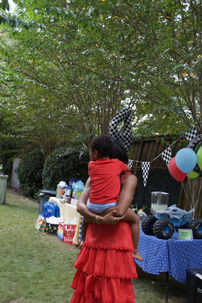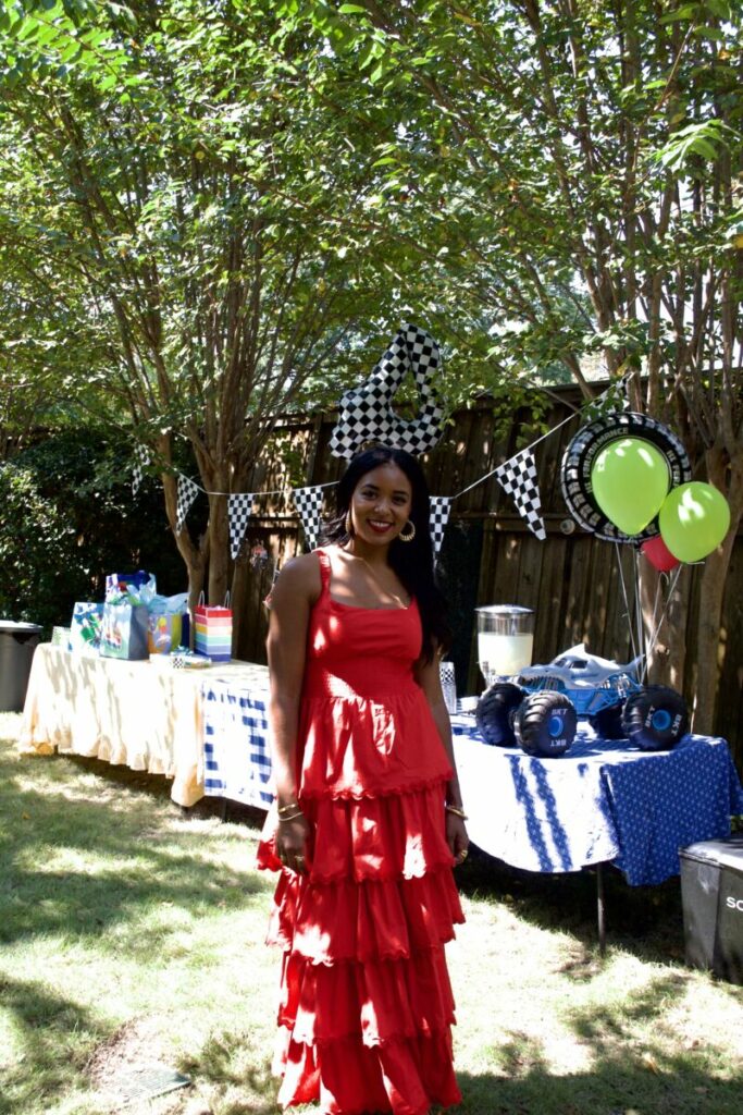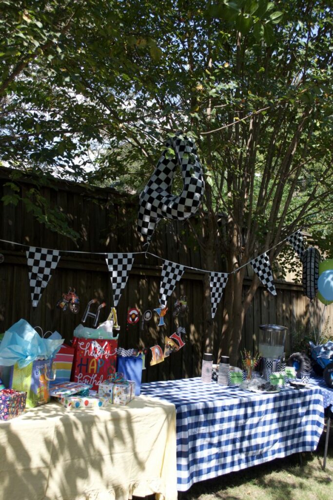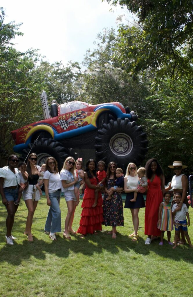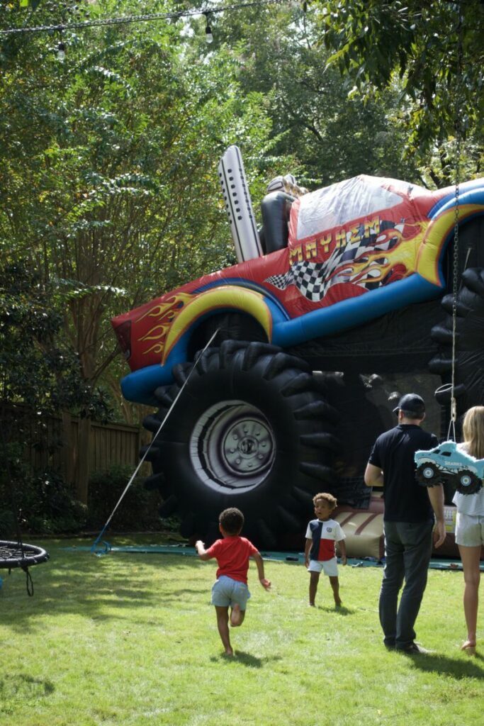 To be honest, she didn’t have a ton of time to prepare. Summer went by fast and then so did September. So, a lot of the decor was just Amazon finds, French linens, and her trusty Mackenzie Childs collection— who’s checkered pattern was almost too perfect for the race theme! But she did have a family friend build a race track for the kids to use with the toy trucks, and then there was the giant inflatable monster truck jump castle that everyone fully thought was gonna be a waterslide (but that’s another story for another day) that kept the kids entertained …until the final summer storm of the season came through!!!
