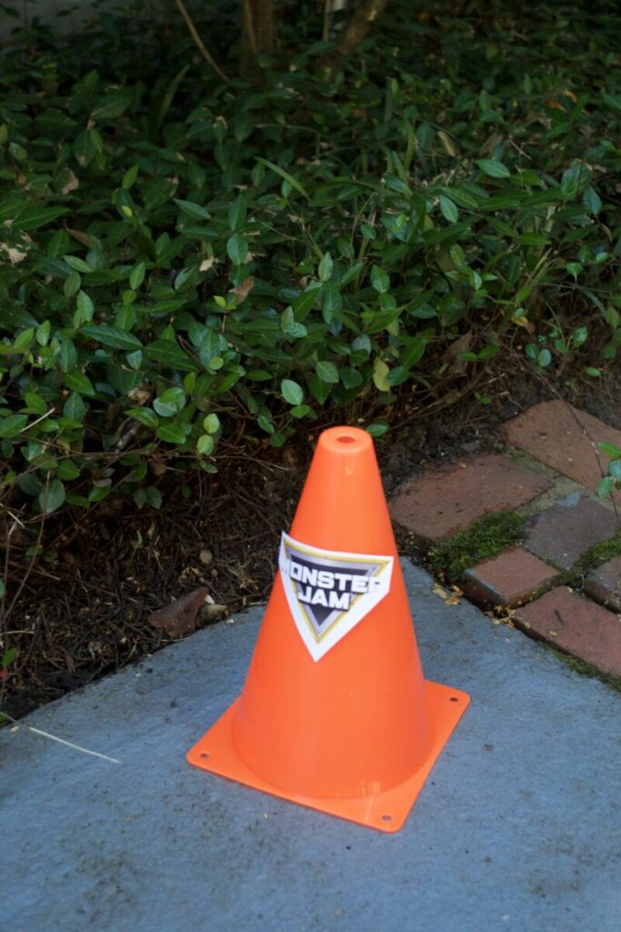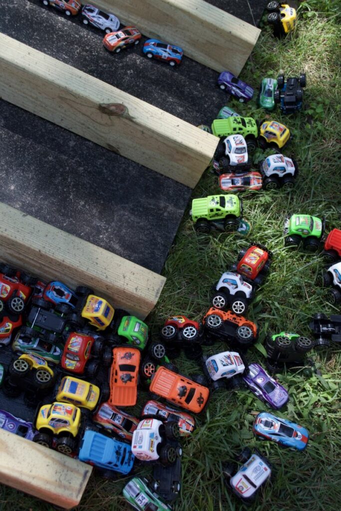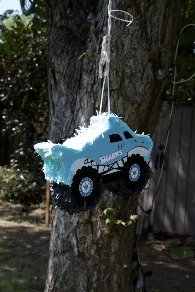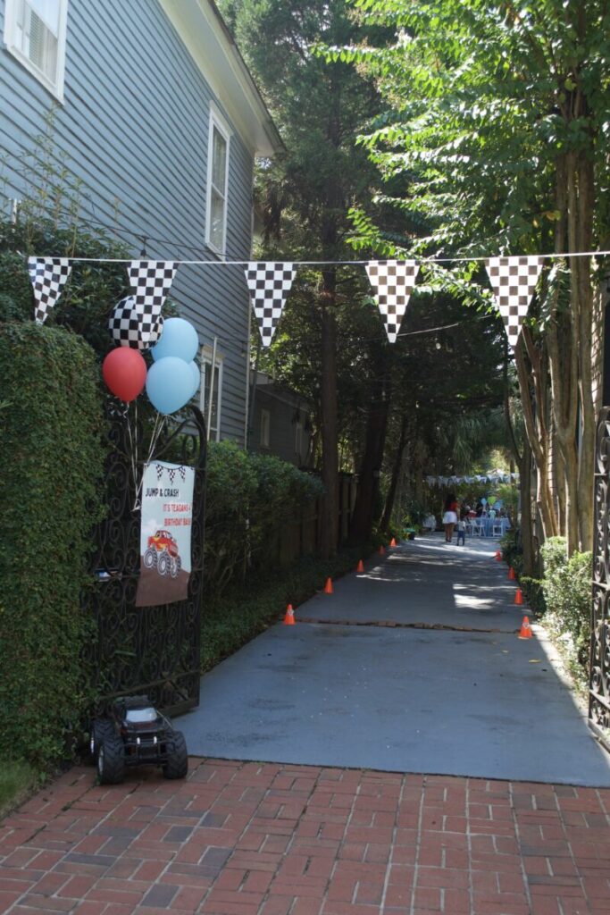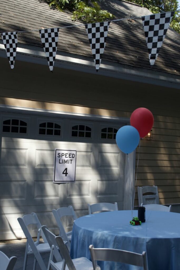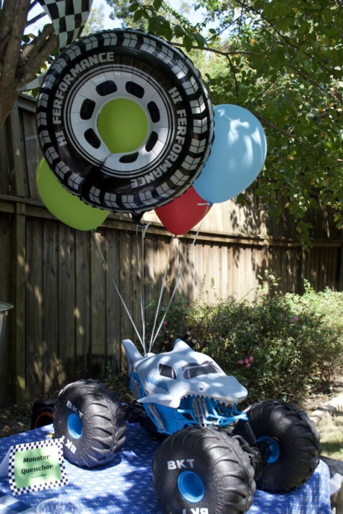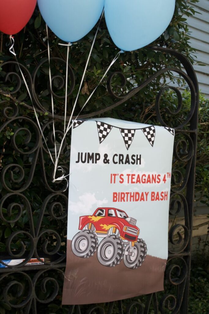 Created “Speed Limit 4” signs on Canva then printed at FedEx. The simple centerpieces were just balloons tied around these monster trucks.