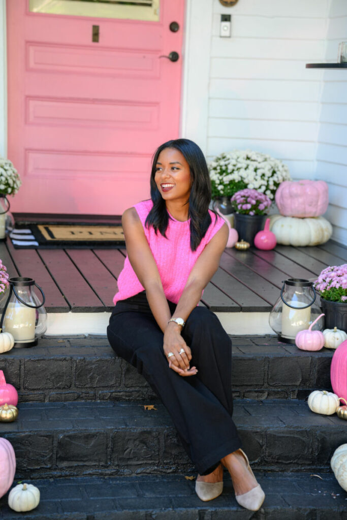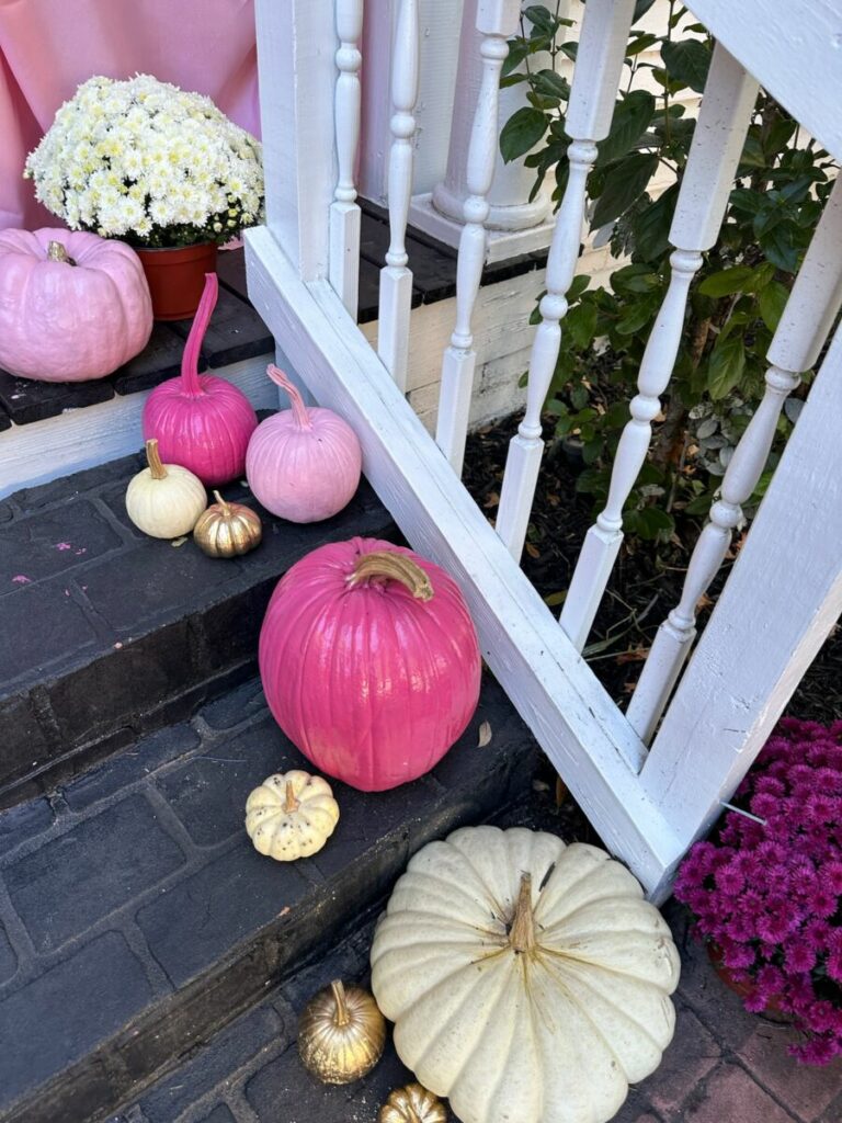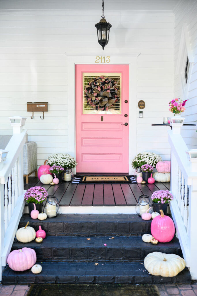 One of the easiest ways to make your fall porch decorations stand out is by choosing a color theme that’s completely different from the natural colors we typically see pumpkins in. Instead of the traditional orange, think outside the box and spray paint pumpkins in unexpected colors. You know we’re gonna choose “shades of pink” and add pops of gold, but your options are truly limitless. Changing the color instantly makes your porch look styled and intentional, but mostly… unique! We recommend adding a wreath and doormat in the same palette for a fully coordinated look.