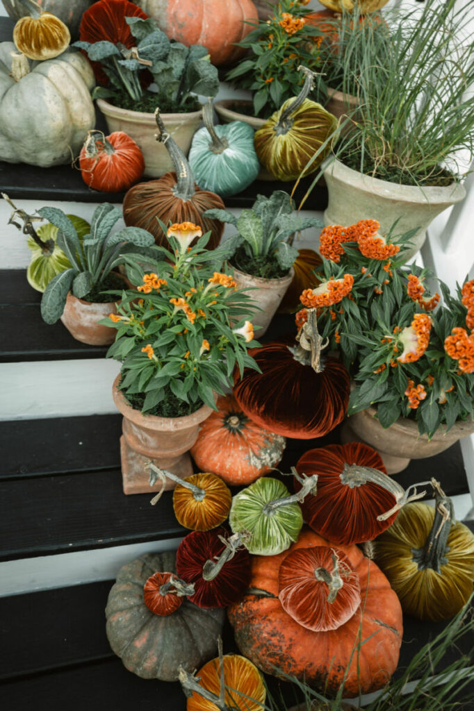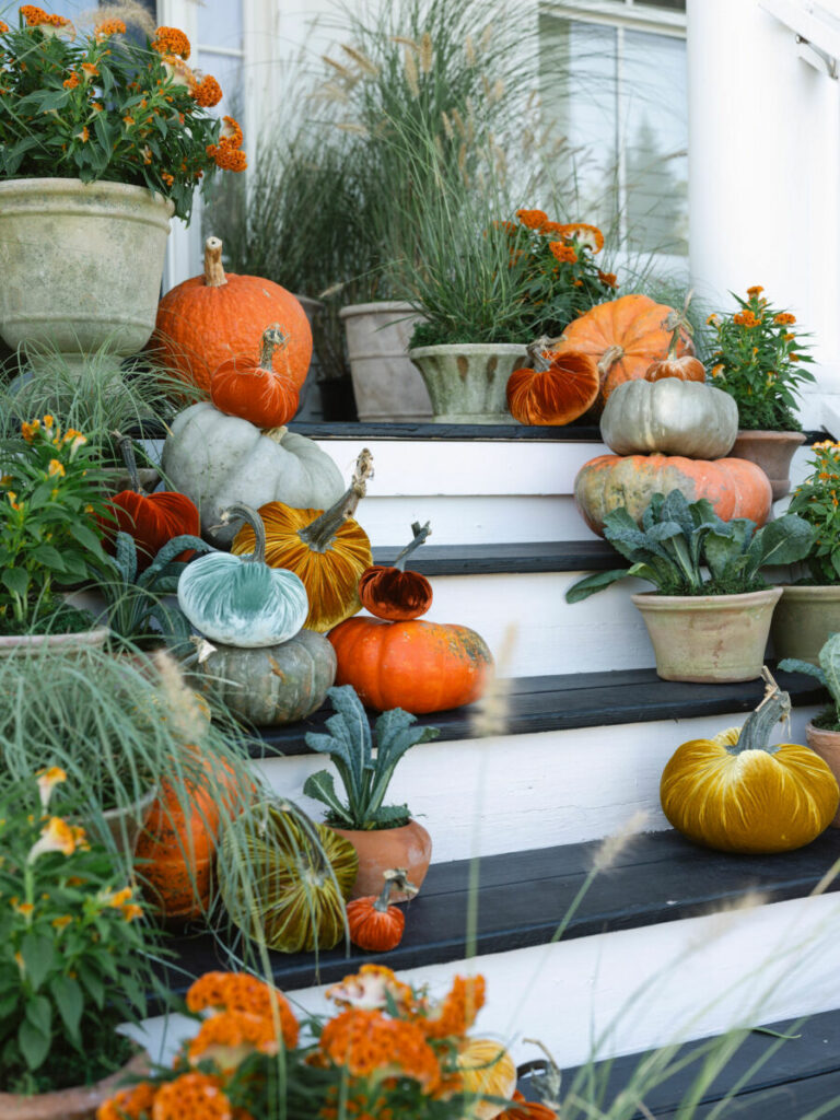 Instead of relying only on pumpkins to drape your porch, try layering in seasonal plants like mums, ornamental cabbage, or even tall grasses in decorative planters to showcase more texture and seasonal feels. And let’s be honest, purchasing dozens of pumpkins adds up. Invest in a set of sustainable pumpkin decor (like from Mackenzie Childs) to fill in gaps and use year after year. Mix in a few real pumpkins for that authentic harvest feel.. This not only creates depth and interest, but also helps your porch decor last longer throughout the season. Pro tip: arrange everything at varying heights— tall plants in the back, medium planters in the middle, and pumpkins spilling onto the steps for a cozy, layered look.